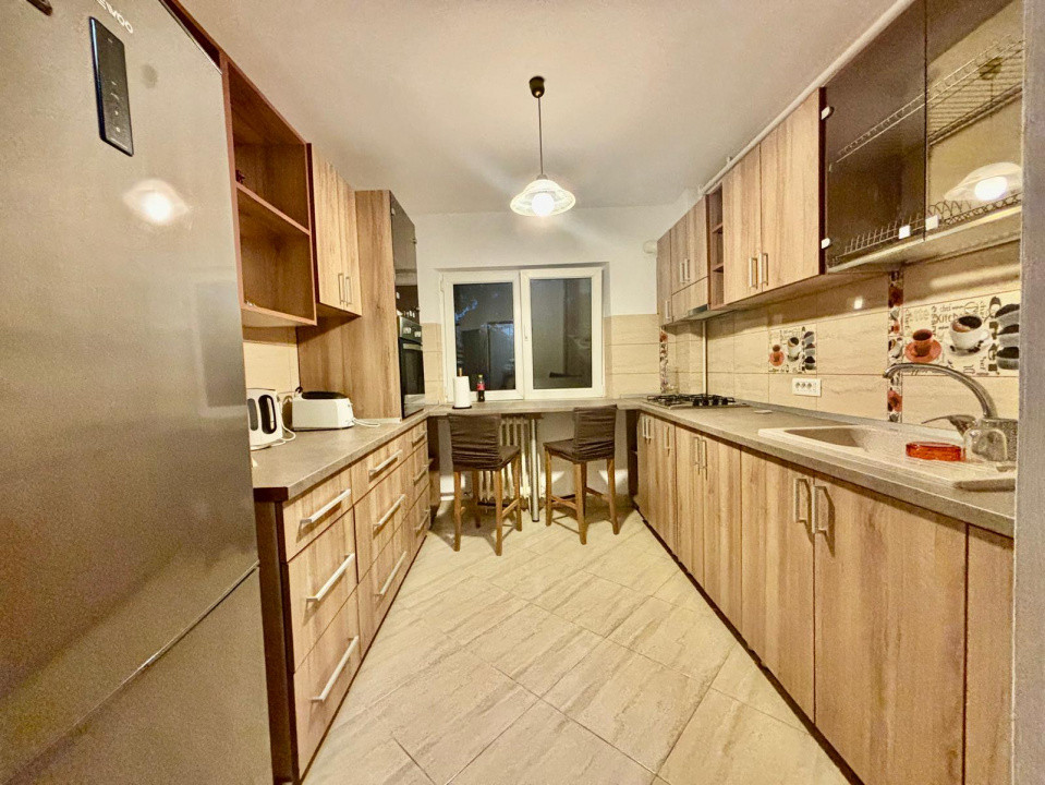 • Bucătărie complet utilată, cu suficiente spații de depozitare și loc pentru servirea mesei